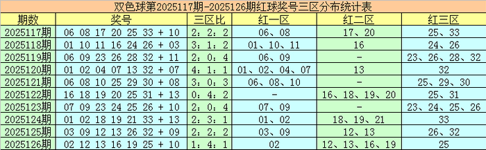 双色球第2025126期开出奖号为:02、12、13、16、19、25+10,其中红球三区比为1:4:1,蓝球开出偶数、大号、1路号码。